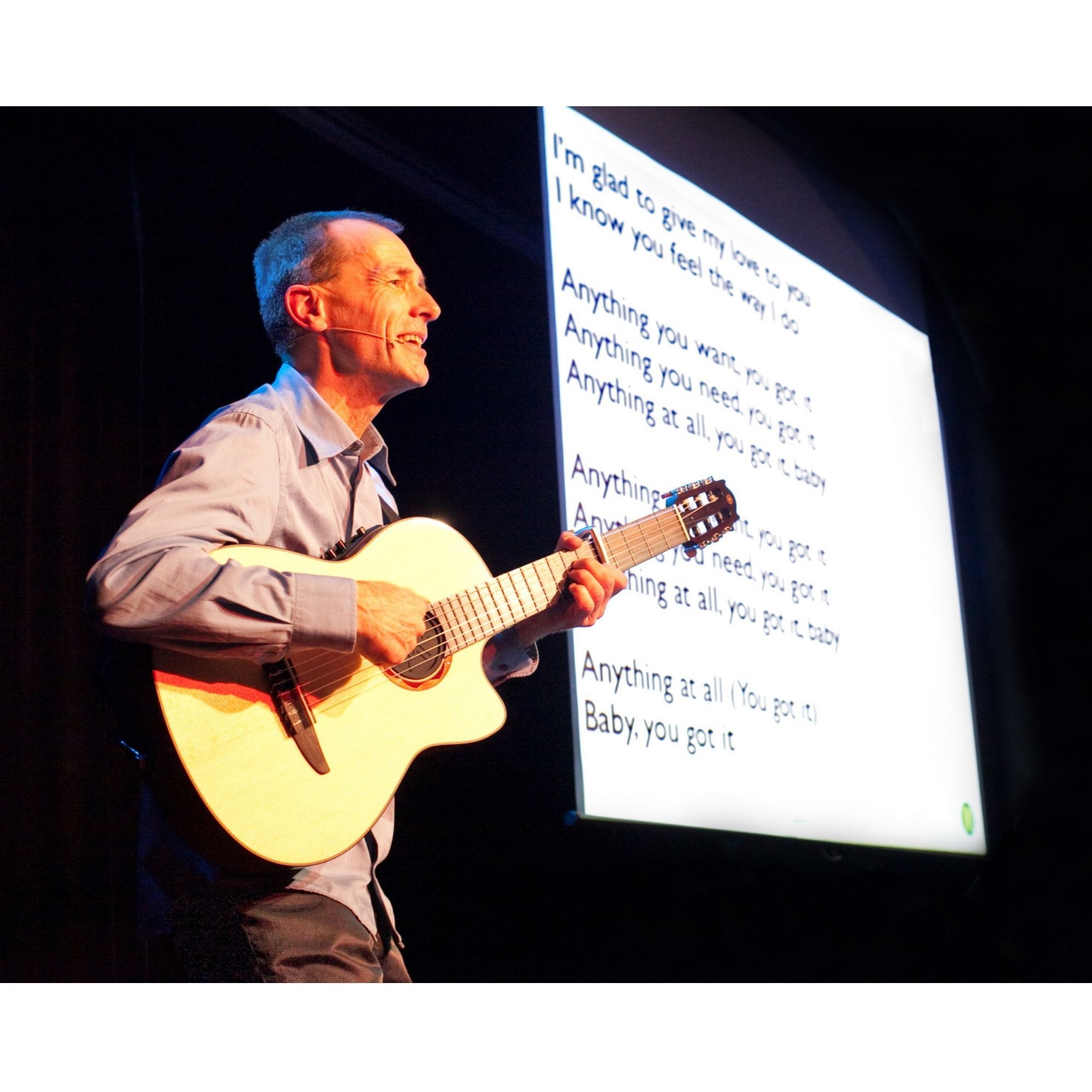 MitSingDing-Macher Stefan Nussbaum singt mitreißend, spielt gekonnt Gitarre und moderiert mit viel Witz.