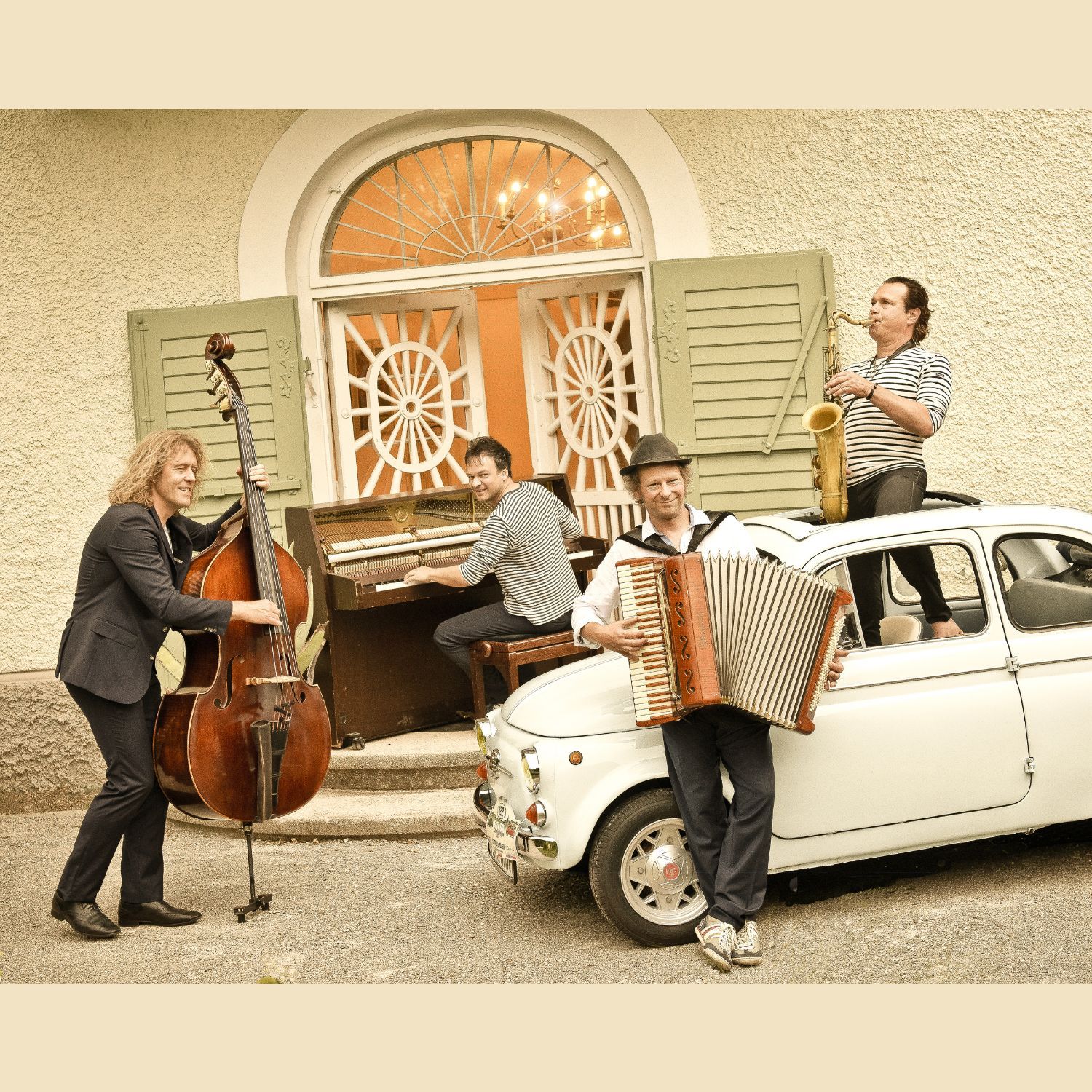 Mit dem extravagant-spielwitzigen Akkordeonisten Andreas Hinterseher und dem durch verschwenderischen Ideenreichtum glänzenden Pianisten Chris Gall leben sie ihre Musik im Hier und Jetzt. Dies erinnert an vier Burschen, die fröhlich musizierend über die südlichen Stadtplätze und Jahrmärkte zogen. So geschehen in den Anfängen von Quadro Nuevo.