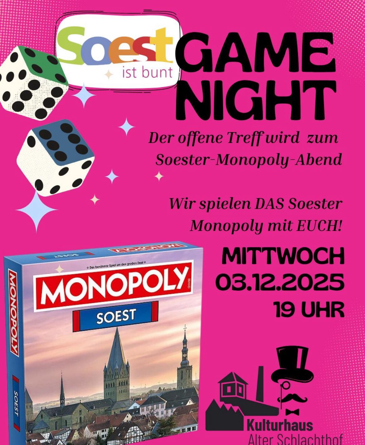 Dieses Mal machen wir dazu aus dem offenen Treffen eine Game Night – wir spielen gemeinsam mit Euch das Soester Monopoly!