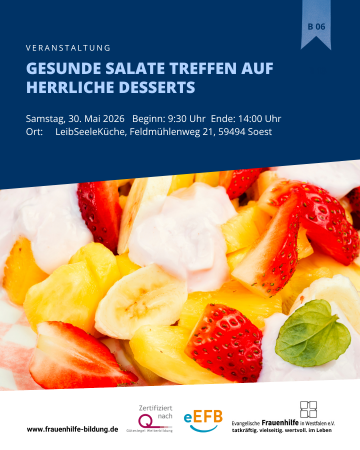Eine ausgewogene Ernährung ist ein wichtiger Baustein für Gesundheit und Prävention. Im Kurs werden frische, vitamin- und ballaststoffreiche Salate sowie leichte, gesunde Desserts zubereitet. Dabei geht es nicht nur um Genuss, sondern auch um die Förderung des Wohlbefindens und die Stärkung des Immunsystems. Die Teilnehmenden erhalten praktische Tipps, wie gesunde Ernährung im Alltag leicht umzusetzen ist – ob für die Familie, die nächste Feier oder einfach für sich selbst.