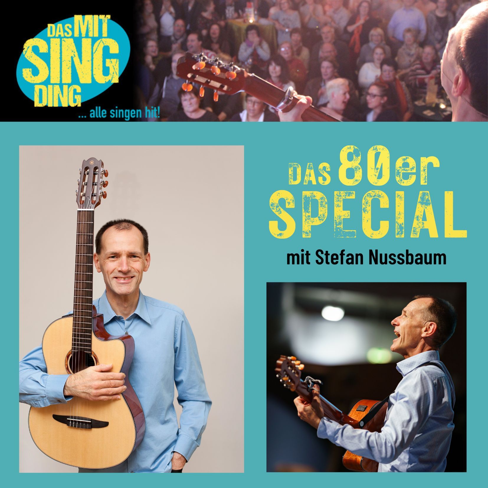 MitSingDing-Macher Stefan Nussbaum singt mitreißend, spielt gekonnt Gitarre und moderiert mit viel Witz.