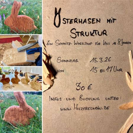 Kids ab 8 Jahren lernen verschiedene Bildhauer- und Schnitzwerkzeuge und deren Handhabung und geeignete Schnitzhölzer kennen. Gemeinsam verwandeln wir einen Hasen-Rohling Schritt für Schritt in einen Osterhasen – und Ostern ist ja schon bald.